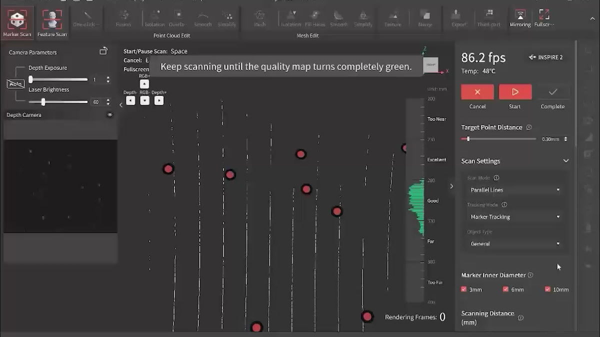 Please use scanning spray when scanning transparent or specular surfaces in Multi-Line Laser modes. Using scanning spray is recommended when scanning transparent, black, specular, or highly reflective surfaces in Full-Field Structured Light modes.