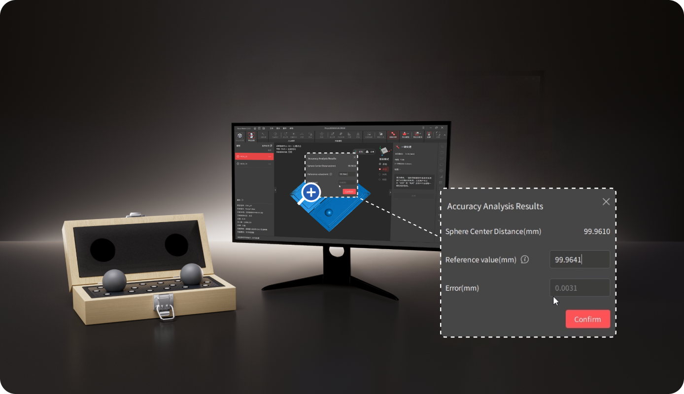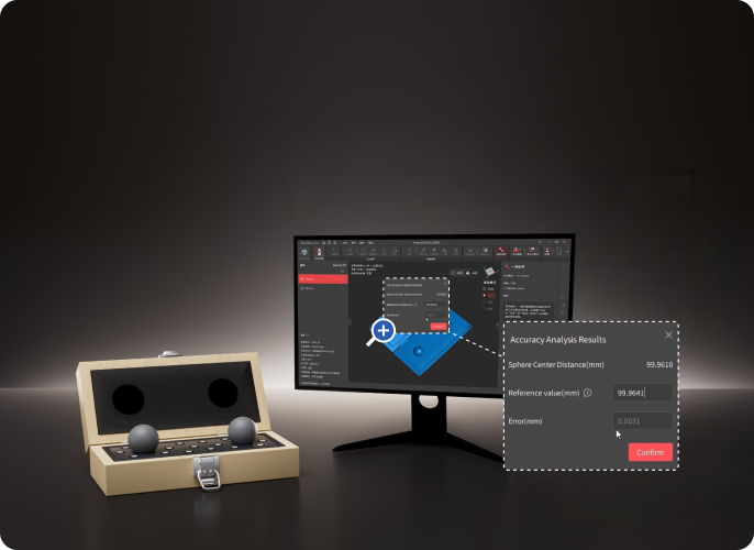 Ensure fast, reliable, on-site, real-time accuracy verification with the CMM-certified carbon fiber ball plate. Simply scan it, and Revo Metro will compare against your ball plate's unique metrology file to calculate volumetric deviation and confirm MetroY Ultra's performance.