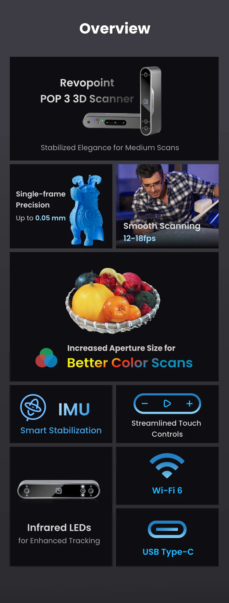 Powered by Wi-Fi 6, POP 3 can transfer data nearly three times faster than POP 2 for lower latency and smoother mobile scanning. And a new USB Type-C connector for compatibility with your other cables and faster to set up.