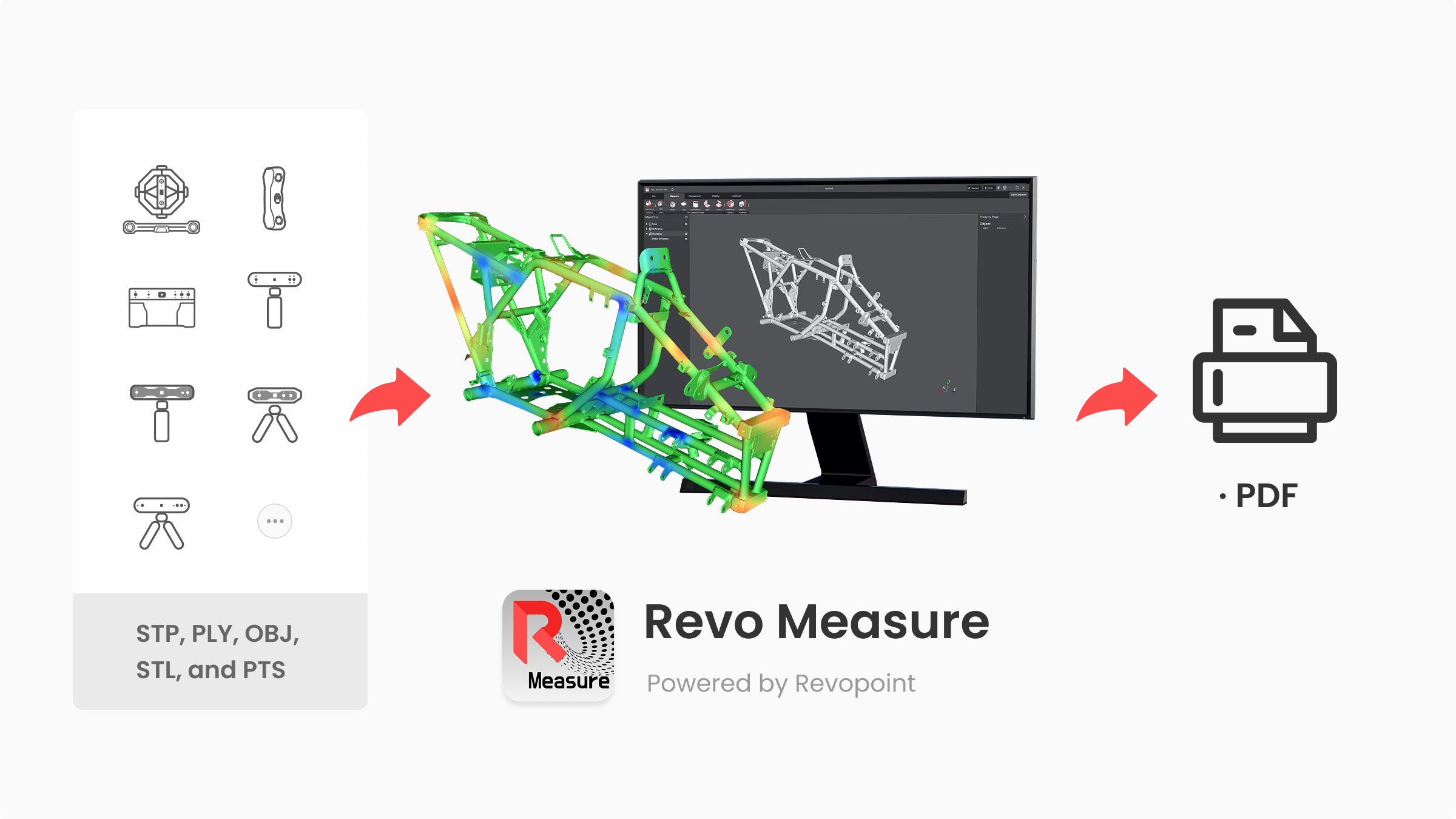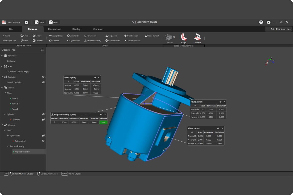 Revopoint Measure is professional 3D metrology software that evaluates shape, dimensions, and quality by comparing point cloud or mesh data to CAD models or drawings. Seamless one-click integration with Revo Scan ensures a smooth and efficient quality control workflow.